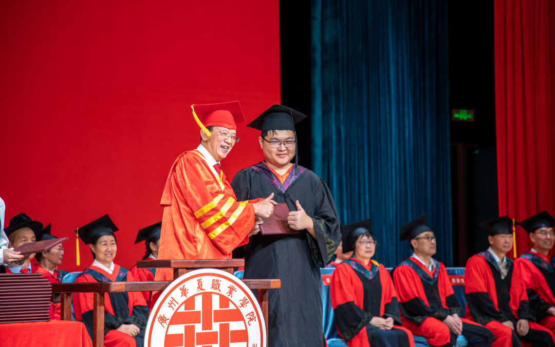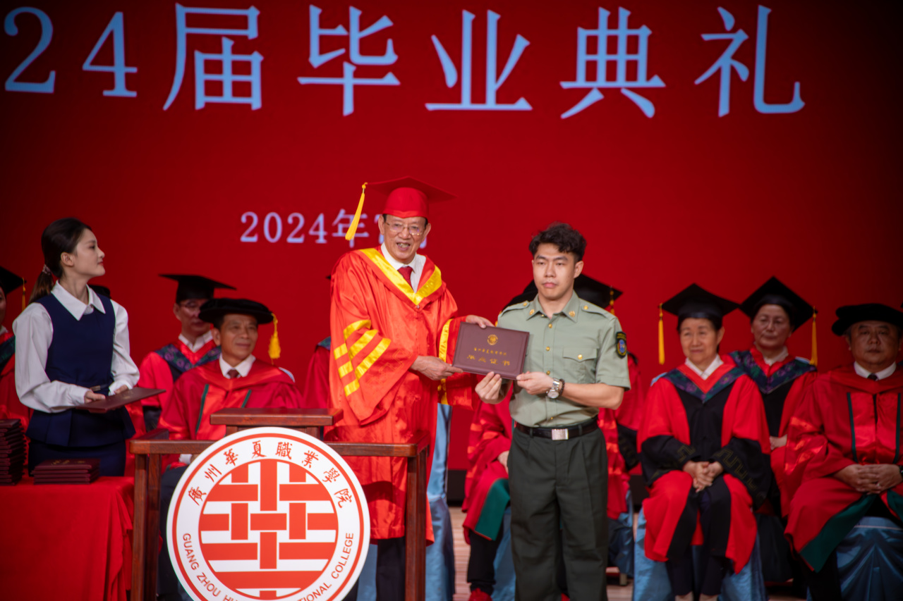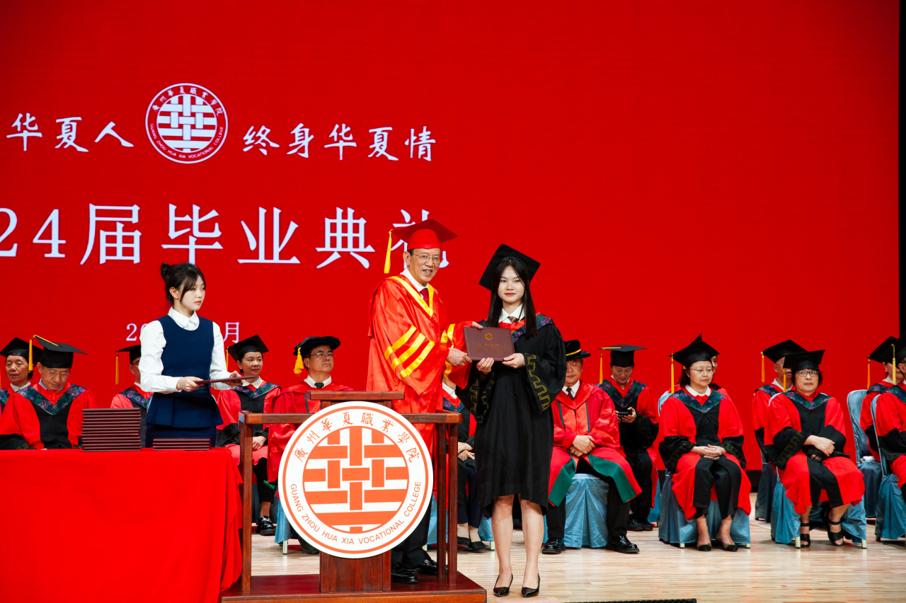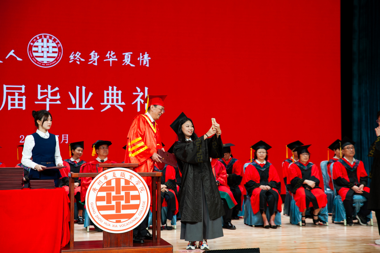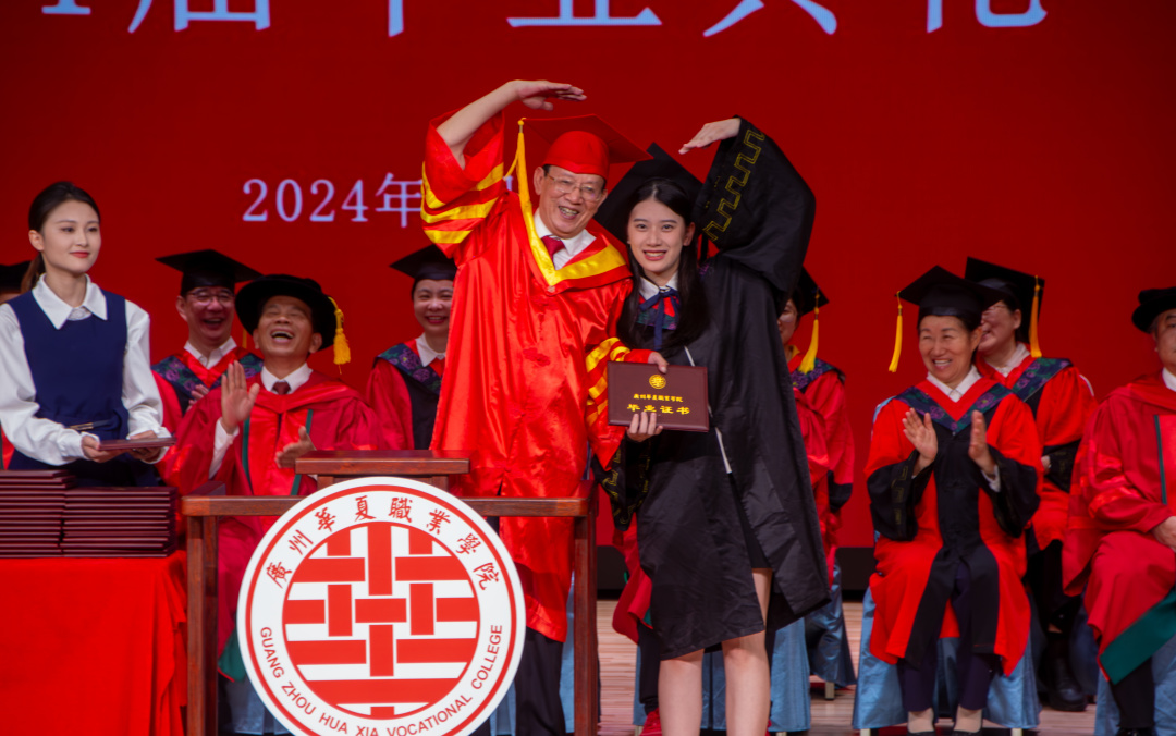 广州华夏职业学院校长邹建华为毕业生们颁发毕业证书,他对毕业生们在华夏学院的成长和进步给予了充分的肯定和赞扬。他鼓励大家在未来的人生道路上,始终保持积极向上的心态,勇敢面对挑战,不断追求卓越。