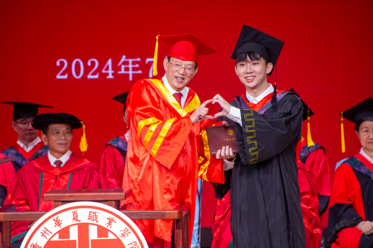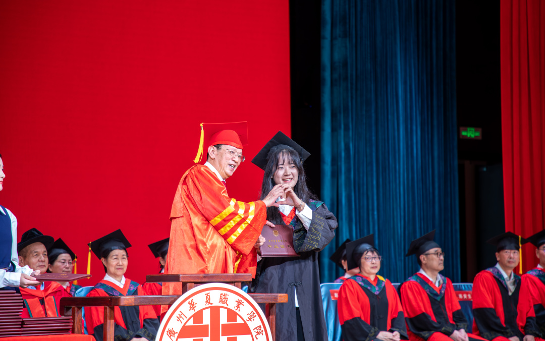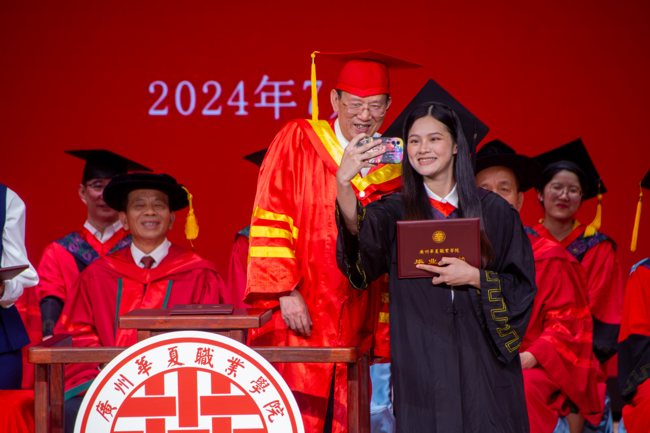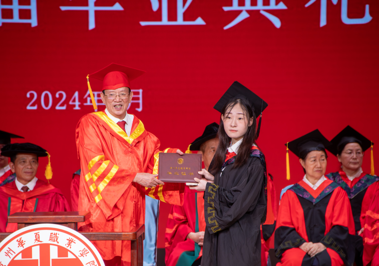 广州华夏职业学院校长邹建华为毕业生们颁发毕业证书,他对毕业生们在华夏学院的成长和进步给予了充分的肯定和赞扬。他鼓励大家在未来的人生道路上,始终保持积极向上的心态,勇敢面对挑战,不断追求卓越。